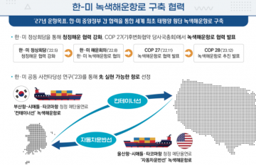 우리나라는 지난 2022년 제27차 유엔기후변화협약 당사국 총회에서 한-미 녹색해운항로 구축 협력을 발표한 이후 사전 타당성 조사를 통해 부산·울산항과 미국 시애틀·타코마 항 간 컨테이너선 항로와 자동차운반선 항로를 예비 녹색해운항로로 선정했다.