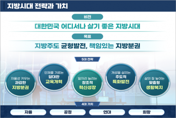 ‘지방시대 비전과 전략’에서는 지방분권과 균형발전을 ‘자율, 공정, 연대, 희망’의 가치로 풀어내고자 했다. 이는 △지방이 고유의 가치를 활용하여 ‘자율’적 발전 기반을 확보하고 △국민 모두가 ‘공정’한 기회를 누리는 가운데 △중앙과 지방이, 농·어촌과 도시가 ‘연대’하여 △지방이 국가 발전을 견인하는 ‘희망’찬 지방시대를 열어가겠다는 뜻이다.