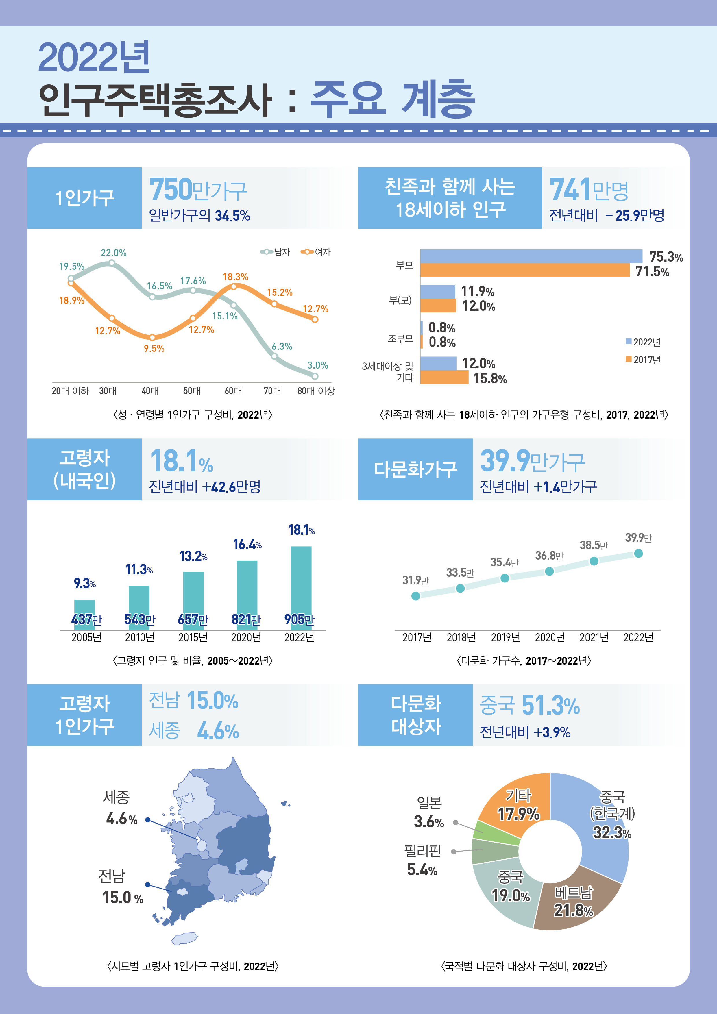 1인가구는 750만가구 (34.5%), 전년 대비 4.7% 증가