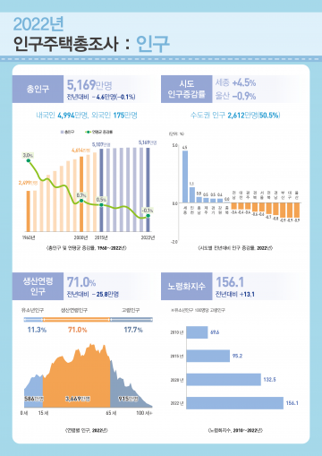 2022년11월1일 기준 총인구 5,169만명, 전년 대비 0.1% (-5만명) 감소