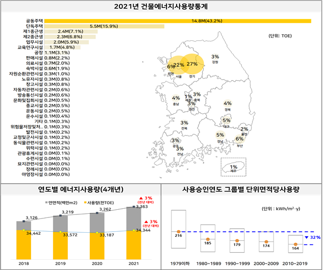 국토교통부는 한국부동산원(원장 손태락)과 함께 전국의 모든 건물을 대상으로 지역별(광역시도 및 시군구), 용도별(29종), 세부용도별(13종)*, 에너지원별(전기·도시가스·지역난방)로 에너지사용량을 집계하여 매년 5월말 건물에너지사용량통계를 발표하고 있다.