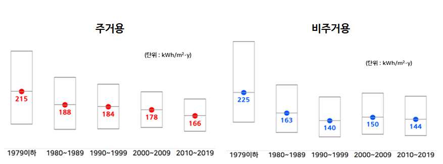 ㅇ 단열기준 도입시점인 1979년 이전 사용승인 받은 건축물 대비 최근 10년 이내에 사용승인을 받은 주거용 건물은 23% (215 kWh/m2·y → 166 kWh/m2·y), 비주거용은 36% (225 kWh/m2·y → 144 kWh/m2·y) 단위면적당 에너지사용량이 감소한 것으로 나타났다.
