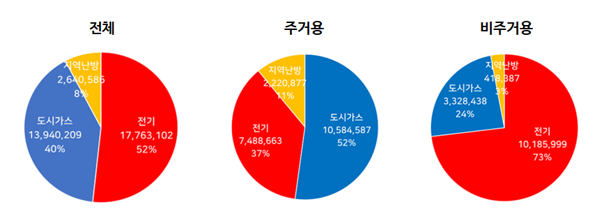 ㅇ (에너지원) 건물부문에서 사용된 에너지를 원(原)별로 분류하면 전기(52%), 도시가스(40%), 지역난방(8%) 순이었으나, 거주형태에 따라 세분하여 살펴보면 주거용은 도시가스(52%)가, 비주거용은 전기(73%)가 가장 많이 사용되는 에너지원인 것으로 집계되었다.