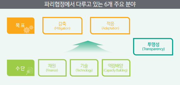 ○ 파리협정은 온실가스 감축(Mitigation)은 물론이고 적응(Adaptation), 재원(Finance), 기술(Technology), 역량배양(Capacity-building), 투명성(Transparency) 등 다양한 분야를 포괄한다.