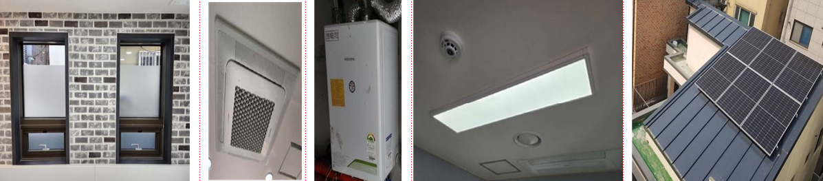 | 창호, 단열개선 | 냉,난방 개선 | LED조명, 환기장치 | 신재생에너지 | |