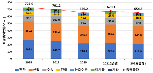 2022년 국가 온실가스 잠정배출량은 6억 5,450만 톤으로 나타났다.