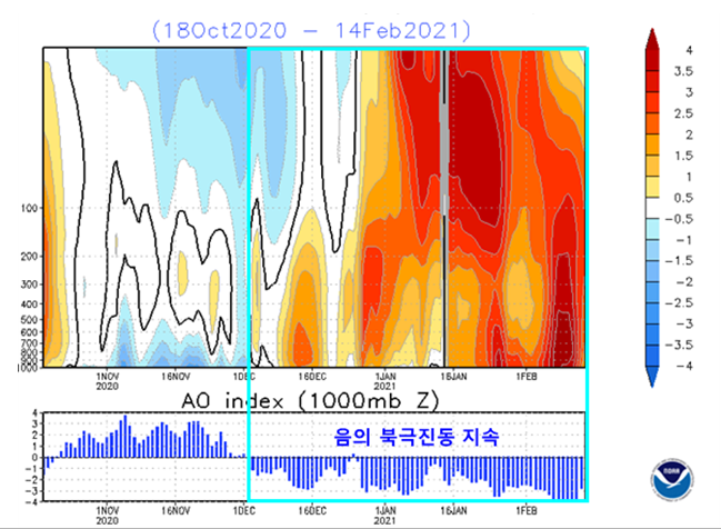 기상청 발표에 따르면, 2020년 12월부터 강한 음의 북극진동*과 함께 2021년 1월 초부터는 성층권 극 소용돌이**가 평년대비 약해지는 현상(성층권 돌연승온)까지 나타나 대기 상층(약 12㎞ 상공)의 제트기류가 약해지면서 북극의 찬 공기가 중위도 지역까지 남하하기 쉬운 조건이 형성되고 있다.