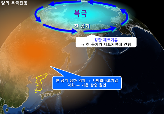 * 북극진동(Arctic Oscillation): 북극에 존재하는 찬 공기의 소용돌이가 수십 일, 수십 년을 주기로 강약을 되풀이하는 현상, 북극 온난화(음의 값)로 대기 상층(약 12km 상공)의 제트기류가 약해지면 북극 찬 공기 남하로 미국, 유럽, 동아시아에 한파 등 기온 변동성이 증가함