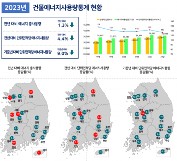 국토교통부의 조사에 따르면 2023년 건물 연면적이 전년보다 증가(3.2%)했음에도 불구하고, 건물에너지 총사용량은 474천TOE* 감소(1.3%)한 35,888천TOE로 집계되었다.
