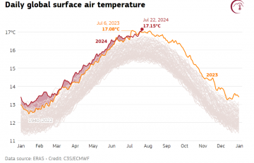 코페르니쿠스 기후 변화 서비스(C3S, the Copernicus Climate Change Service)에 따르면, 2024년 7월 22일의 1일 지구 평균 기온이 17.15°C로 지구 역사상 최고를 기록했다.