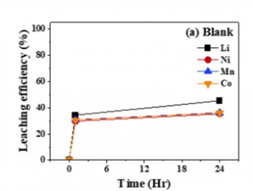 (a) Blank (미생물 미접종 상태의 pH 1.8 맞춘 배양액) 조건에서 24시간 내 금속 침출률이 Li (리튬) 40%, Co (코발트), Mn (망간), Ni (니켈) 약 33%를 확인하였다.